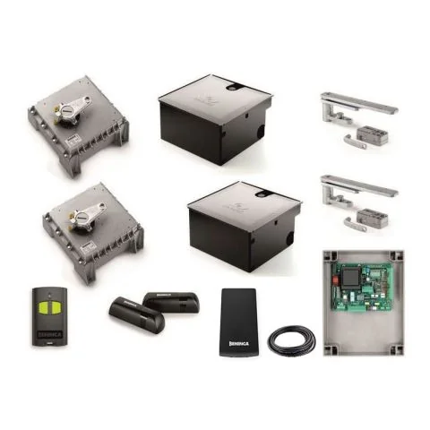 Deze complete kit wordt geleverd incl. 1 besturing, 2 motoren, 2 motorbakken, een paar fotocellen Pupilla, een handzender en een antenne.
