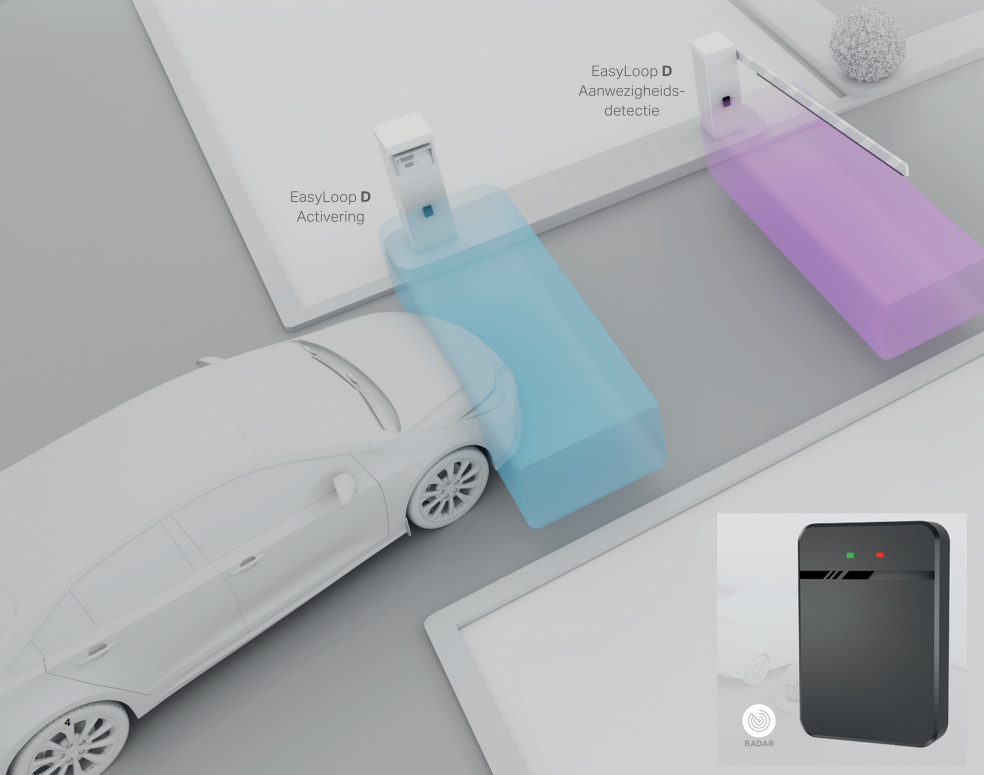 Deze detector werkt met een virtueel detectieveld dat automatisch wordt aangeleerd. Wanneer een voertuig het detectieveld binnenkomt, stuurt de Easy Loop een signaal naar de besturing van de poort of slagboom.