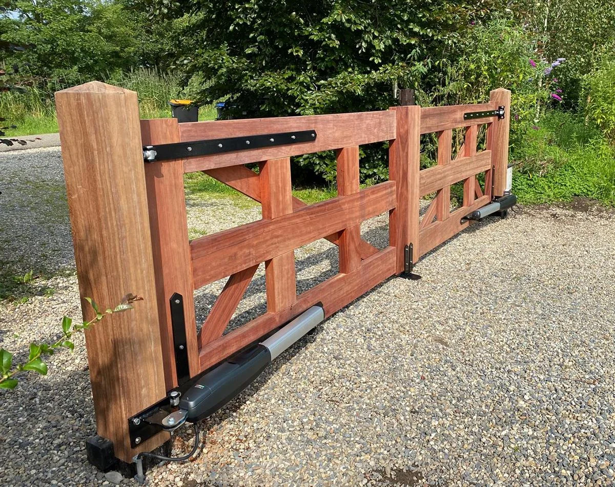 Houten poort is gemaakt door Farm Poorten. Poortautomatisering door Porttech.